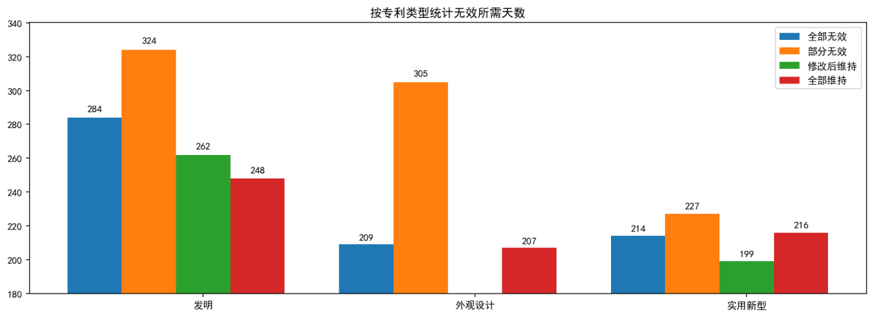上图为按专利类型统计的无效请求作出决定平均所用天数。总体上看,发明专利无效决定的用时要多于外观设计专利和实用新型专利,其中,每一类型下都是部分维持的决定耗时最久。这可能是由于与全部维持或者全部无效相比,部分维持的案件可能相对更加复杂,更难以作出决定。
