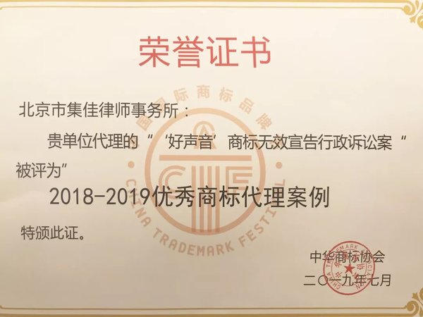 >懂球帝官网>关于我们>荣誉概览>2019>集佳代理“好声音”商标无效宣告行政案入选“优秀商标代理案例”